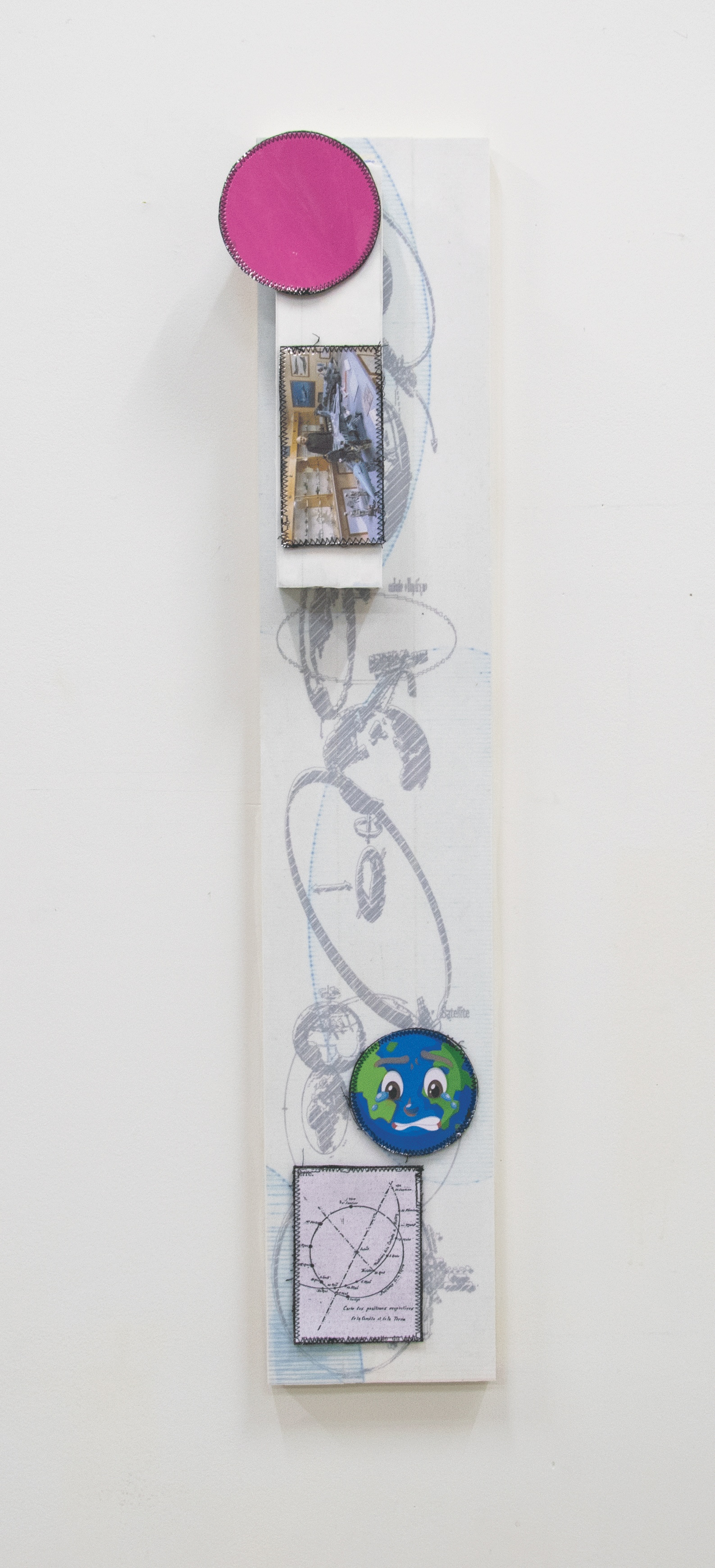 Scratch cousue, Impression laser, pvc transparent, feutres et stylos, contrecollage sur bois; 15x80cm.